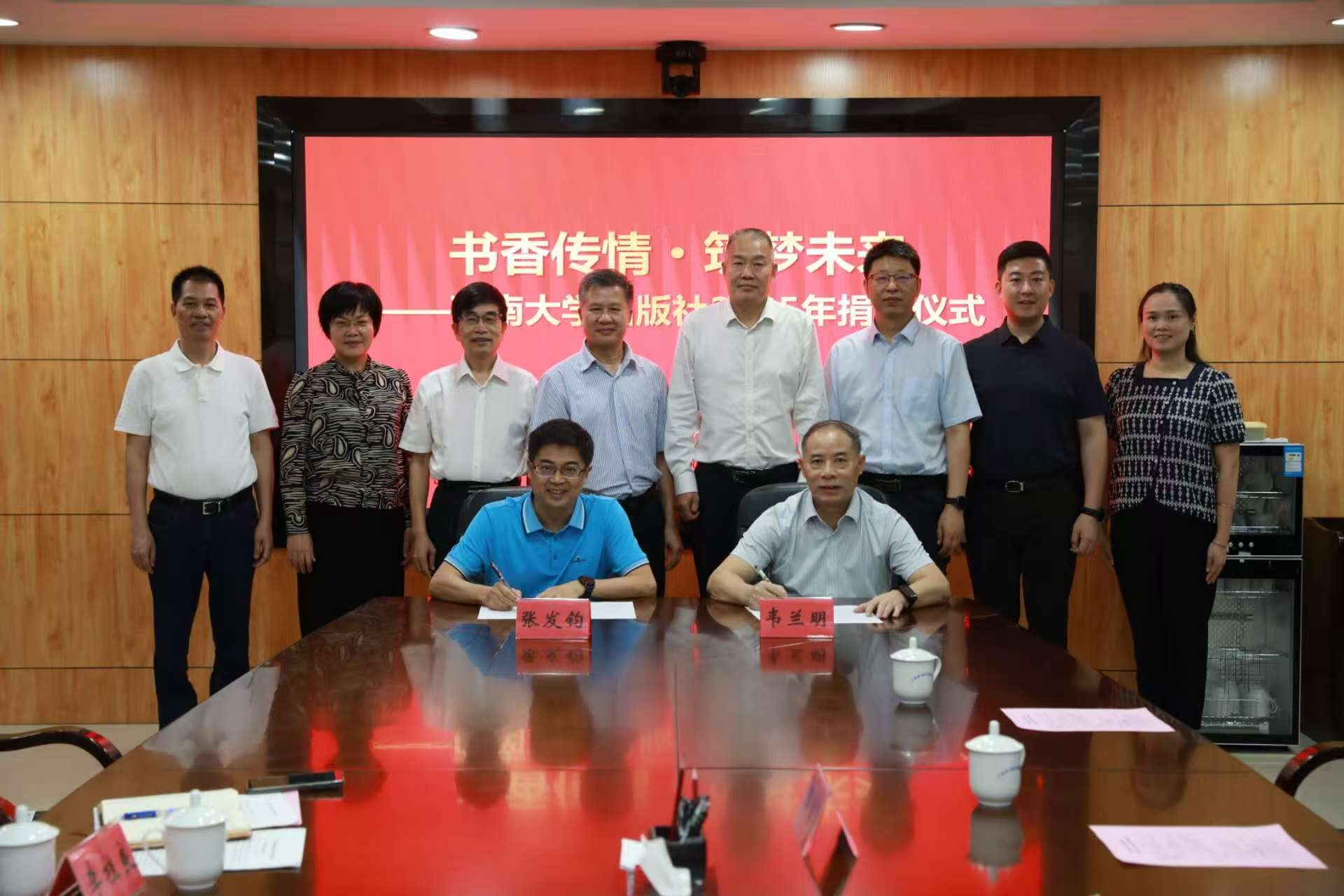 在全体嘉宾的见证下,西南大学出版社与基金会双方领导签署捐赠协议,靳玉军总经理代表出版社向基金会递交了象征性捐赠支票,韦兰明理事长向出版社颁发了捐赠纪念牌匾。
