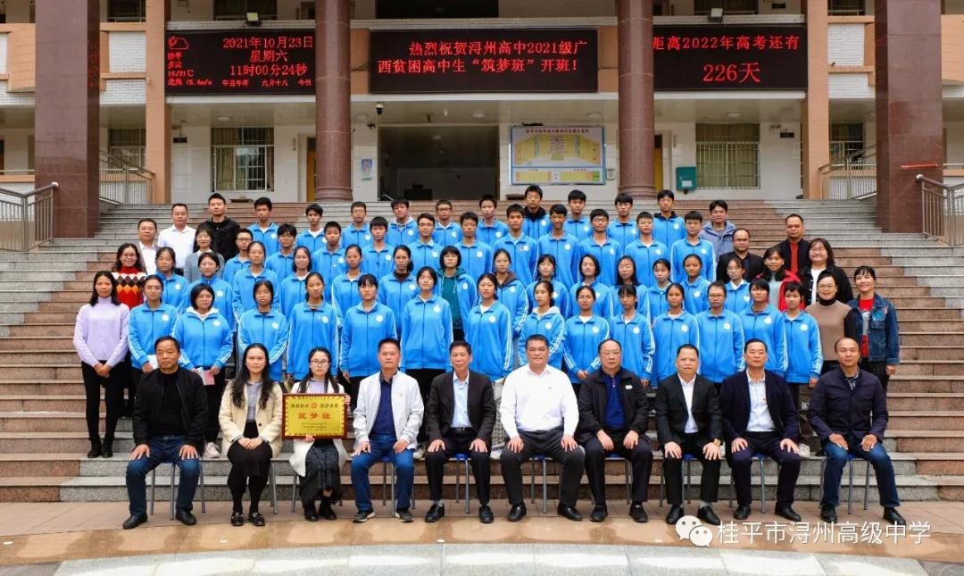 2021年10月23日上午10时,浔州高中2021级“筑梦班”开班典礼在学校图书馆阶梯教室如期举行。广西民族教育发展基金会理事长黄富雁、秘书长蒋万文,桂平市教育局副局长江冰,浔州高中教育发展协会副会长、广西跑腿快车电子商务有限公司总经理刘荣,浔州高中党委书记、校长汪均裕,桂平市各初中校长,浔州高中有关领导,“筑梦班”全体师生及家长代表等出席了开班典礼。