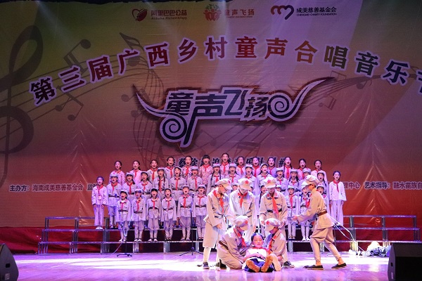 汇报演出开始前,“童声飞扬”项目负责人为本届音乐节致辞,他表示,项目在广西融水开展三年以来,获得了社会各界的认可和支持,甚至推动了当地政府重视音乐素质教育,以“童声飞扬”项目模式为标杆在全县开展合唱教学。同时也希望融水能继续坚持以“带进来,走出去”的形式,让小朋友们更为直接地感受音乐艺术和民族文化魅力。最后他还特别感谢项目团队的付出,感谢阿里巴巴公益及蔡徐坤粉丝应援团对“童声飞扬”项目的大力支持,他们帮助乡村学生实现了在绚丽舞台放声歌唱的童年梦想,促进了融水县传统音乐文化的传承与推广,推动了校园精神文明建设。