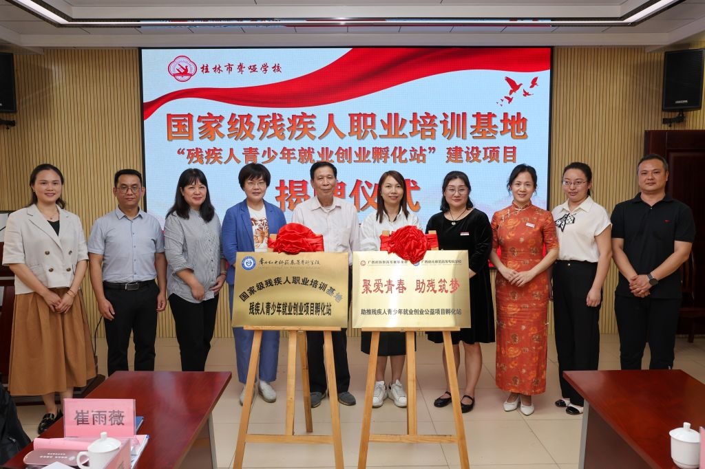 广西特殊教育师资培训中心主任陈扬东、副主任黄严和桂林市教育局副局长蒙亮、桂林市聋哑学校校长程斌为国家级残疾人职业培训基地“残疾人青少年就业创业项目孵化站”揭牌