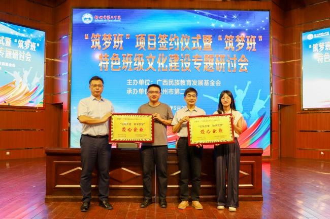 “筑梦班”项目的顺利实施,离不开爱心企业的大力支持。近年来,教育科学出版社、广西接班人教育科技有限公司、华谊集团等爱心企业积极履行社会责任,参与“筑梦班”资助,共同为“筑梦班”学子提供生活补助和奖学金,传递着社会的温暖与关爱。签约结束,基金会向教育科学出版社广西服务中心、广西接班人教育科技有限公司、华谊集团等爱心企业颁发荣誉牌匾,表彰其为广西教育公益事业作出的贡献,并以此汇聚更多社会力量,共同助力民族教育事业的长远发展。