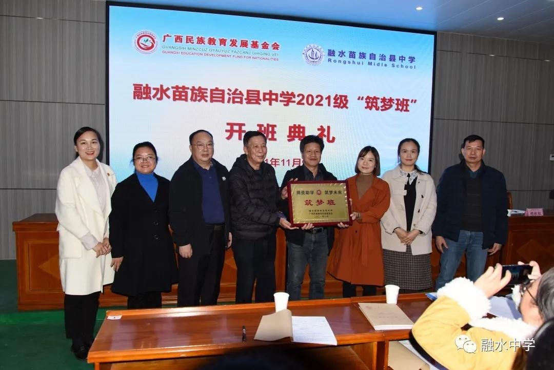 11月9日,融水中学2021级“筑梦班”开班典礼在学校报告厅隆重举行,广西民族教育发展基金会理事长黄富雁,广西民族教育发展基金会秘书长蒋万文,广西民族教育发展基金会项目主管满妍,融水中学何培源校长,赵光兵副校长以及2021级“筑梦班”全体师生及家长代表参加本次开班典礼,会议由融水中学高一年级主任杨茜喆主持。