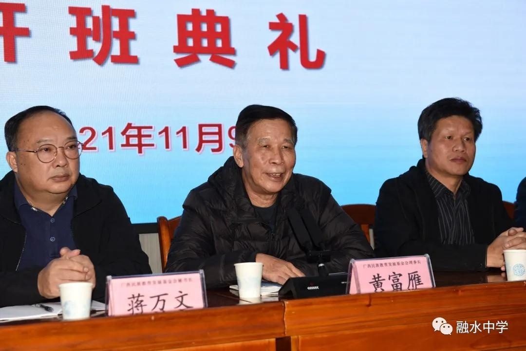 随后,广西民族教育发展基金会理事长黄富雁发表讲话,他强调筑梦班建班的初心以及严格的标准,希望学校继续加强对筑梦班的组织领导和建设,严格按照要求进行规范管理,同时也希望筑梦生能够在学校的培养下全面成才,基金会会竭尽全力帮助每个筑梦生筑梦、追梦、圆梦。青年是国家的希望,民族的未来,每个筑梦生都要勇于担当,胸怀祖国,对得起筑梦班的荣誉,要有自己的理想和目标以及追求,格局要放大,眼光要放远,学会学习,学会做人,以实际行动实现自己的胸怀抱负,为中华民族的伟大复兴而奋斗。